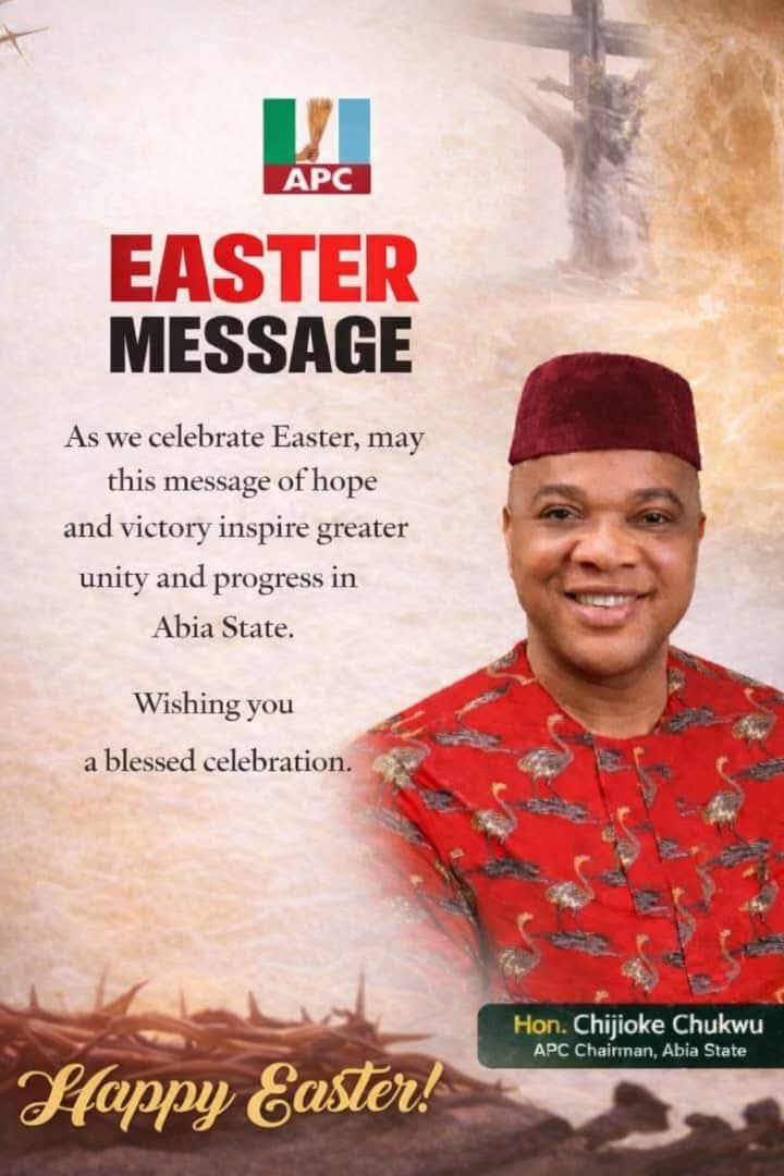 The Abia State Chairman of the All Progressives Congress (APC), Chijioke Chukwu, has extended Easter greetings to the people of the state and party faithful, calling for unity, hope, and renewed commitment to building a better Abia.