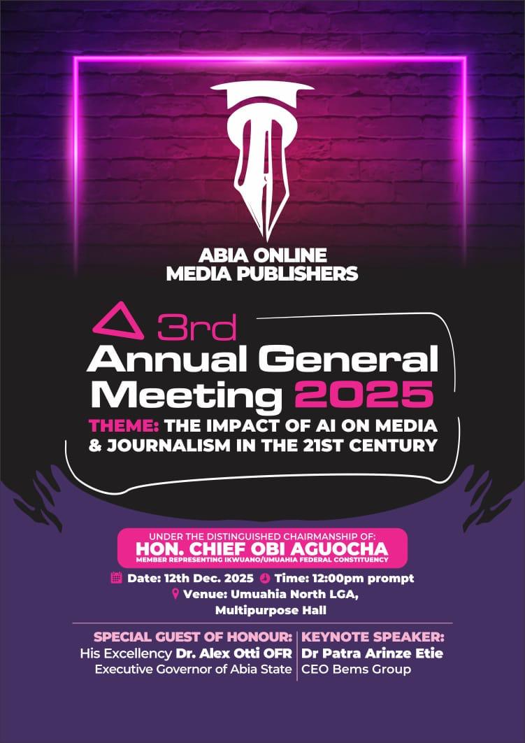 All is now set for the Abia Online Media Publishers to hold her 3rd Annual General Meeting With The Theme: “The Impact of AI on Media and Journalism”.