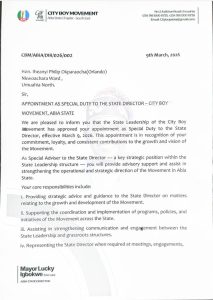 According to the announcement, Hon. Iheanyi Philip Okparaocha (Orlando) has been appointed Special Adviser on Special Duties to the State Director. In this capacity, he will provide advisory support and assist in strengthening the operational and strategic direction of the movement in Abia State.