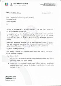 The appointments were approved by the Abia State Director of the movement, Lucky Igbokwe, popularly known as Don Lulu.