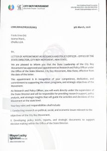 Speaking on the appointments, Lucky Igbokwe expressed confidence in the capacity and commitment of the appointees, noting that their emergence will further strengthen the City Boy Movement’s structure and effectiveness in Abia State.