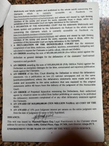• An Additional N50,000,000.00 (Fifty Million Naira) as exemplary damages for the purported false and injurious publication.