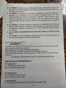 • An Award of N5,000,000,000.00 (Five Billion Naira) as general damages for the alleged defamation of the Claimants’ hard-earned reputation and goodwill.