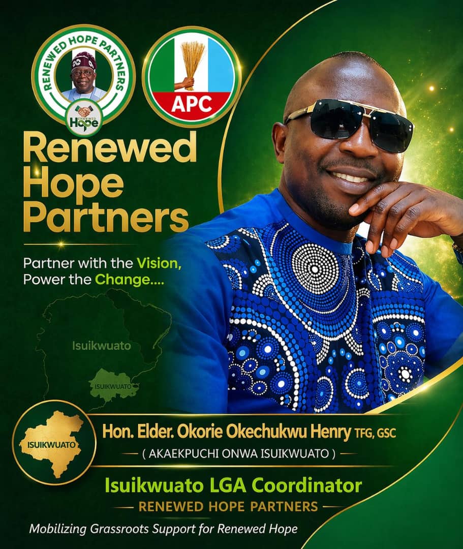 As political activities continue to build up, the Renewed Hope Partners, a pro-group of the All Progressives Congress (APC), has announced Hon. Okechukwu Okorie as its Isuikwuato Local Government Area Coordinator.
