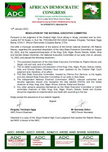 After a thorough consideration of the actions of the former ADC National chairman, Mr Ralphs Nwosu, regarding the purported dissolution of the Abia State Executive Committee on August 02, 2022, and the suspension/expulsion of the Kogi, Edo, Niger, Rivers Sokoto, Kebbi, Abia and Gombe States Chairmen, the National Executive Committee of the  party met on January 10, 2023 and passed the following resolutions that the so-called suspension and expulsion of the Kogi, Edo, Niger, Rivers, Sokoto, Kebbi, Abia and Gombe States Chairmen have been quashed by the Federal High Court judgment and, therefore, of no effect.