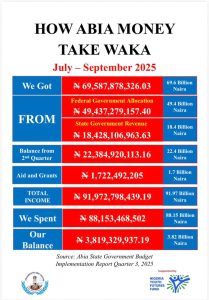 Abia State’s financial status has remained at the centre of public debate in recent weeks, following revelations that the state received a staggering N38 billion in total revenue between April and June 2025, excluding Local Government (LG) allocations. With LG monthly allocations averaging N11 billion, and the state government retaining full control of LG finances, Abia’s combined monthly inflow now floats around N49 billion.