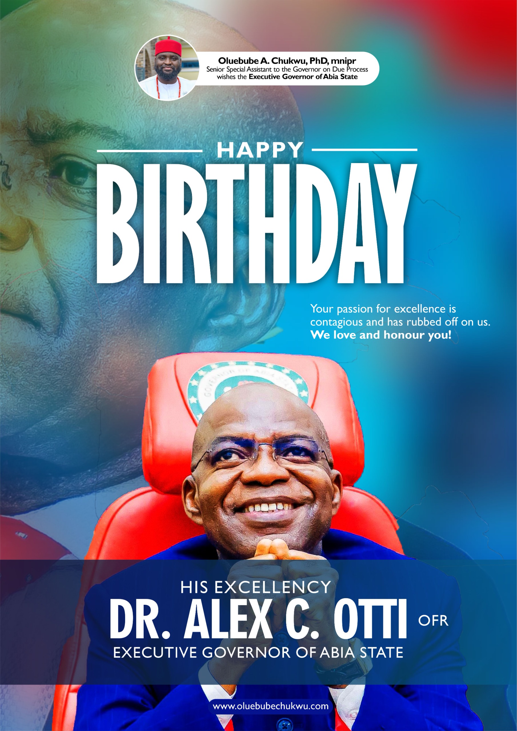The Senior Special Assistant (SSA) on Due Process to the Abia State Government, Dr Oluebube Chukwu, has extended heartfelt felicitations to Governor Alex Otti, OFR, on the occasion of his 60th birthday.