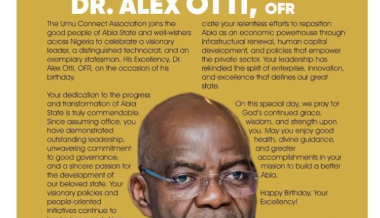 The Umu-Aba Connect Association has joined the good people of Abia State and well-wishers across Nigeria to celebrate the Governor of Abia State, Dr Alex Otti, describing him as a visionary leader,  distinguished technocrat and an exemplary statesman.