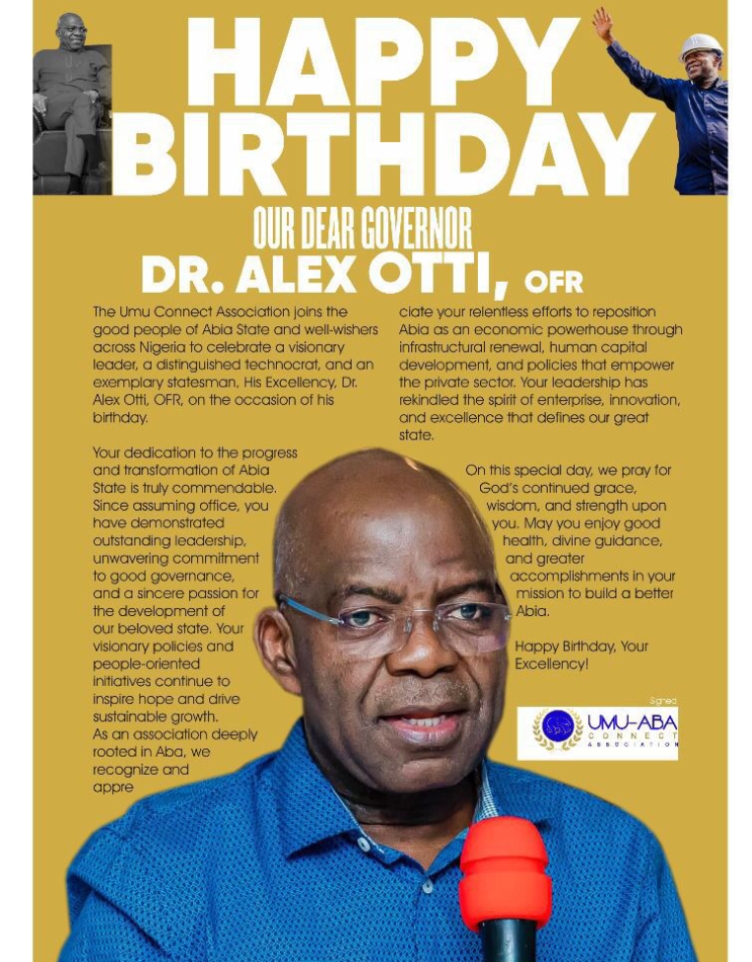 The Umu-Aba Connect Association has joined the good people of Abia State and well-wishers across Nigeria to celebrate the Governor of Abia State, Dr Alex Otti, describing him as a visionary leader, distinguished technocrat and an exemplary statesman.